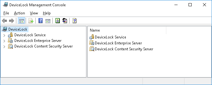 DeviceLock Management Console consists of a window divided into two panes. The left pane contains the console tree; the right pane contains details. When you select an item in the console tree, information about that item is displayed in the details pane.