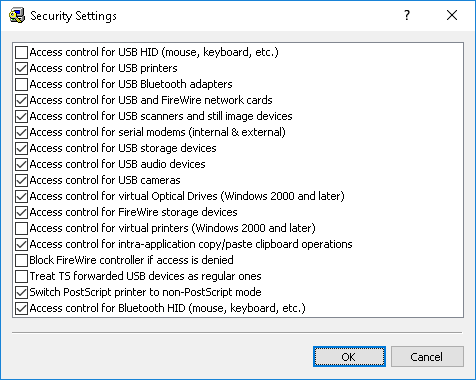 DeviceLock provides a number of additional security parameters that affect permissions and audit rules for certain device types. These security parameters provide the ability to keep some device types completely locked, but allow the use of certain device classes without the need to authorize every device in the white list. For example, you can disallow the use of all USB devices except any mouse and keyboard devices that connect through the USB. For further details, see