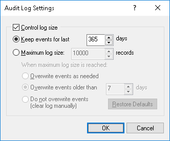 •Keep events for last <number> days - When this option is selected, the log stores records no older than the number of days specified (365 days by default).