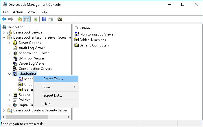 Note: If the DeviceLock Enterprise Server service is configured to run under the Local System account, you cannot install, update or remove DeviceLock Services on remote computers using a Monitoring task on DeviceLock Enterprise Server. |
