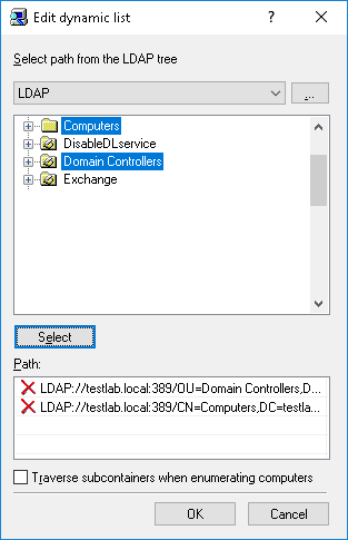 2. Dynamic list - Instead of computer names or IP addresses, the dynamic list contains a path to the container (for example, an organizational unit) in the directory service tree (such as Active Directory, Novell eDirectory, OpenLDAP and so on). Every time the task is executing, DeviceLock Enterprise Server retrieves all the computers that currently exist in this container. Hence, if some computer was removed from the directory tree or moved to another container it will not be monitored anymore. And vice versa, if there is some new computer that did not exist in the container at the time the task was created/modified, but was added to this container later, it will be retrieved and monitored at the time of executing the task. You can select one or more containers.