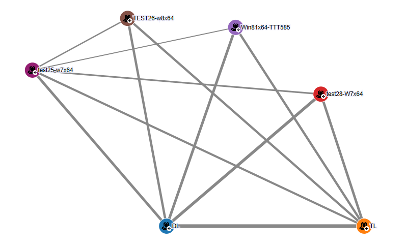 Graphs are composed of two main components: nodes (participants) and lines. A node represents an Active Directory (AD) object, such as a domain, an organizational unit (OU), or a user. A line represents a connection or relationship between two nodes. Connections between two nodes (participants) are calculated based on the total number of instant messenger chats, files transferred through instant messengers, calls, social network chats, e-mail messages, and e-mail attachments between them. Thin lines indicate a weak communication relationship, while thick lines represent a strong communication relationship.