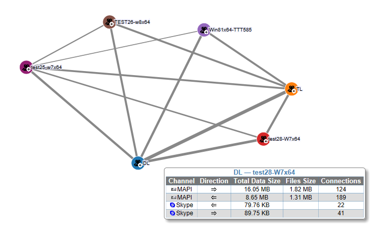 When you point to a line, a pop-up window displays information about a relationship between the connected nodes. This information includes a communication channel (for example, Skype, MAPI), the direction of communication (incoming/outgoing), the total size of the data and files transferred, and the number of connections (such as instant messenger chats, files transferred through an instant messenger, Skype calls, social network chats, e-mail messages, and e-mail attachments) per channel.