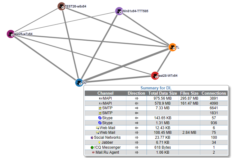 Relations charts let you explore statistical data on a user’s protocol-related activities through interactive graphical visualizations of data collected into audit and shadow logs, including the deleted shadow data log. These reports are displayed in the form of graphs. Graphs use data types such as instant messenger chats, files transferred through instant messengers, calls, social network chats, e-mail messages and attachments, and are generated for the following protocols: IBM Notes, ICQ Messenger, IRC, Jabber, Mail.ru Agent, MAPI, Skype, SMTP, Social Networks, Telegram, Viber, Web Mail, WhatsApp, and Zoom. However, relations charts may not reflect deleted shadow data specific to the size of file transferred through instant messengers and e-mail attachments.
