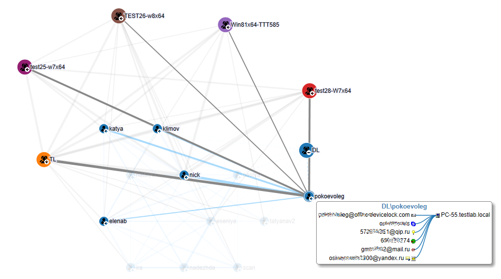 When you point to a user’s node, a pop-up window displays information about this user. This information includes the user’s name in the following format: DOMAIN\UserName (for example, DL\katya), the name(s) of the user’s computer(s), and the user’s identifiers (such as e-mail addresses, social network and instant messenger IDs).