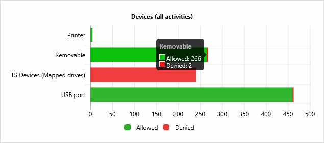 The bar is divided into two segments: the green segment represents allowed actions while the red one stands for denied actions. The length of the green segment indicates the number of allowed actions; the length of the entire bar indicates the total number of actions, both allowed and denied. To view numeric readings, hover over a bar. A pop-up window will appear that indicates the device type or protocol corresponding to the selected bar, and also displays the numbers of user actions that were allowed or denied for this device type or protocol within the reporting period.