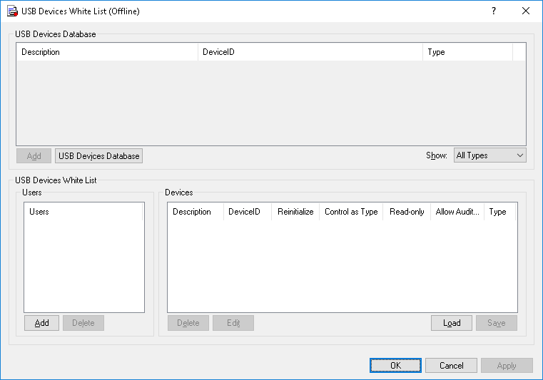 4. In the upper pane of the USB Devices White List (Offline) dialog box, under USB Devices Database, click USB Devices Database.