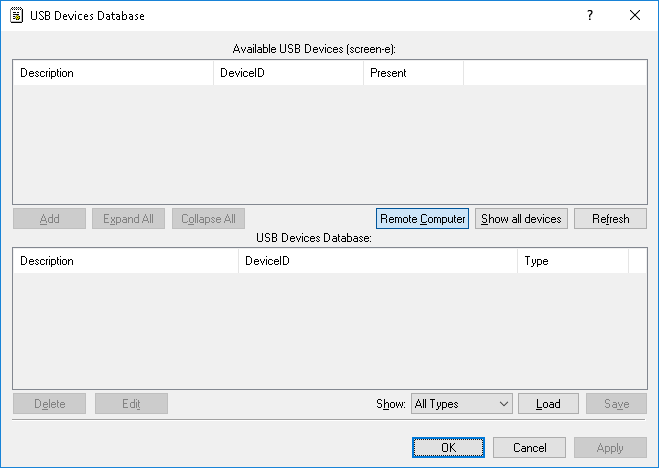 To delete a device from the USB Devices Database, in the lower pane of the USB Devices Database dialog box, under USB Devices Database, do one of the following: