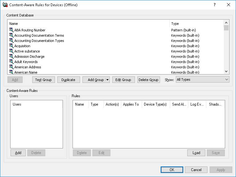 The users and groups that you added are displayed under Users in the lower-left pane of the Content-Aware Rules for Devices (Offline) dialog box.