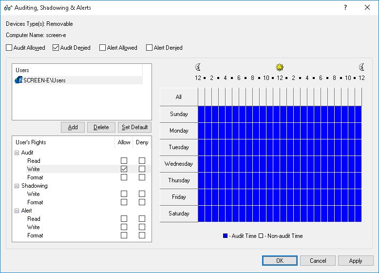 2. Click the Add button in the Audit dialog box and add the Everyone user. Click OK to close the Select Users or Groups dialog box and select the Everyone record. Disable all audit rights and enable only the Write shadowing right in the User’s Rights list.