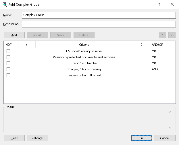 b) Click Add. In the Content Groups dialog box, select the following groups: Credit Card Number, Images, CAD & Drawing, Images contain 70% text, Password-protected documents and archives, and US Social Security Number.