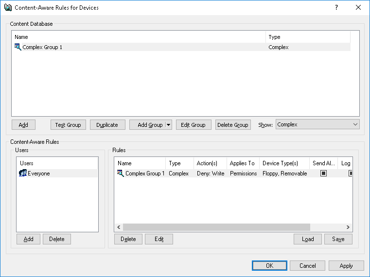 6. In the Content-Aware Rules for Devices dialog box, under Content Database, click the drop-down arrow next to Add Group, and then click Complex.