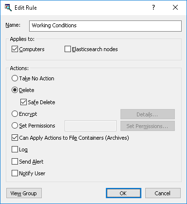 •Can Apply Actions to File Containers (Archives) - Select to allow applying an action (Delete, Set Permissions, Encrypt) to the entire compressed archive (such as a ZIP or RAR file) in which the matching content was discovered. If this option is not selected, the action will not be applied to the container.