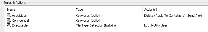 Content-dependent detection rules in .cwl format can be loaded from a file. When loading rules from a .cwl file, Log Event and Send Alert parameters are automatically converted into Log and Send Alert respectively. If the source rule does not have these parameters, you will need to specify the required action. Such rules will be displayed with an exclamation point icon as shown in the screen below.