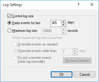To use the default log size, select the option Maximum log size and click Restore Defaults. The default log size settings are as follows: