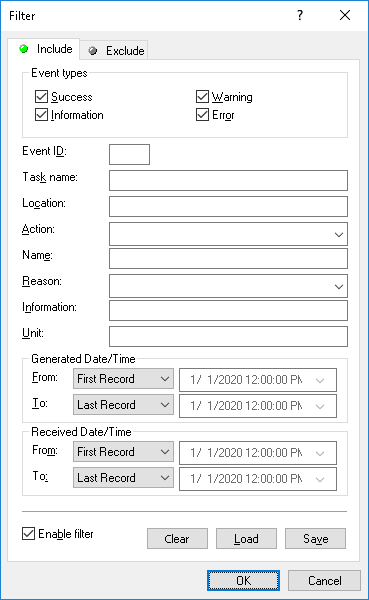 •String fields that allow you to include or exclude events depending upon whether event data matches the filter string specified. For example, to filter events by the name of the task that caused the event, specify a filter string in the Task name field. To filter events with certain IDs, enter ID numbers separated by a semicolon in the Event ID field.