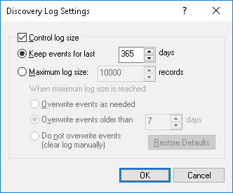 To use the default log size, select the option Maximum log size and click Restore Defaults. The default log size settings are as follows: