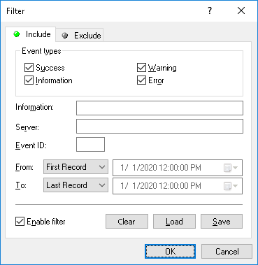 •Information, Server, Event ID - Include or exclude events depending upon whether event data matches the filter string specified. For example, to filter events by the name of the computer on which the event occurred, specify a filter string in the Server field. To filter events with certain IDs, enter ID numbers separated by a semicolon in the Event ID field.