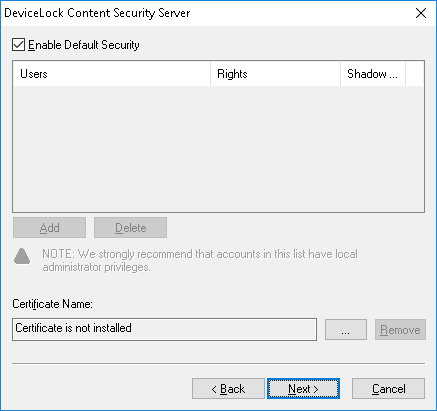On this page of the wizard, you can set up the list of users that have administrative access to DeviceLock Content Security Server, and install DeviceLock Certificate (the private key) if needed.