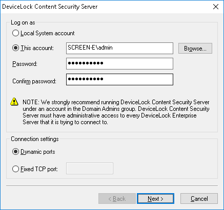 If you are installing DeviceLock Content Security Server in the domain environment, we recommend that you use a user account that is a member of the Domain Admins group. Since Domain Admins is a member of the local group Administrators on every computer in the domain, members of Domain Admins will have full access to every computer.