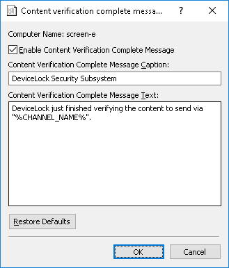 You can define a Content verification complete message to be displayed to users when DeviceLock completes content inspection of data copied to Removable Devices or TS Devices (Mapped drives).