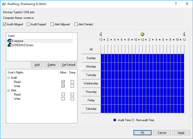 Use the Set Default button to set default audit and shadowing rules for devices: members of the Users group and the Everyone account have Read and Write audit rights and shadowing is disabled for them.