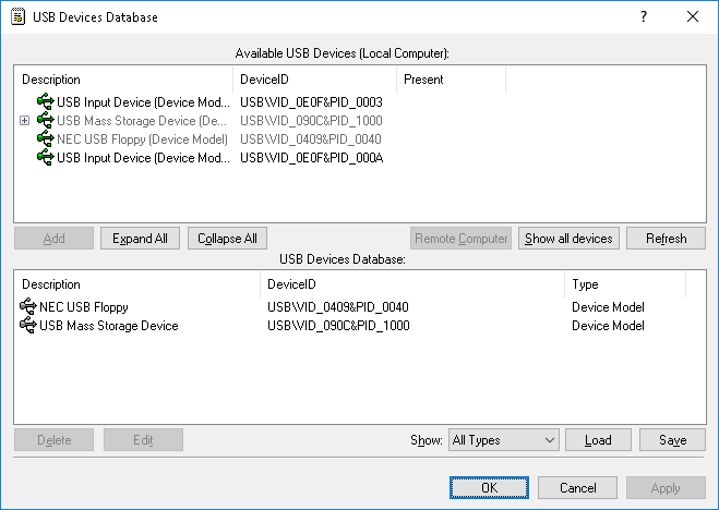 In the USB Devices Database list at the bottom of the dialog box, you can see devices that are already in the database. You can add devices to this list by selecting the desired device’s record in the Available USB Devices list and clicking Add. If the device is already in the database, it cannot be added there a second time.