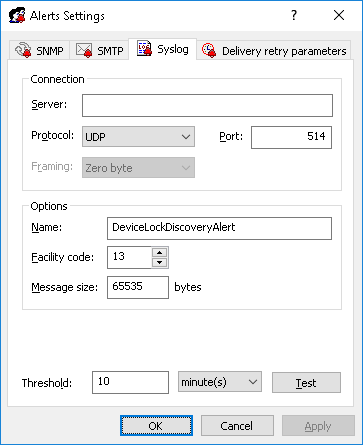 Use the Syslog tab in the Alerts Settings dialog box to configure DeviceLock Content Security Server for syslog.