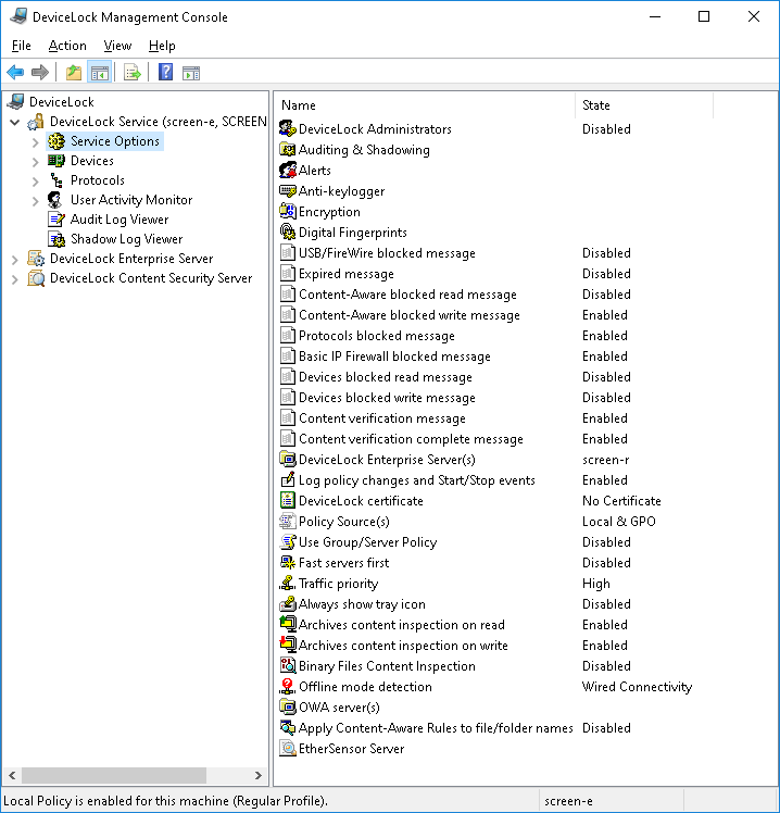 •DeviceLock Service can receive its settings from the Acronis cyber protection system. The status bar of the DeviceLock Management Console displays the message “Acronis Cyber Protect Policy is enabled for this machine” and you cannot change the settings by using the DeviceLock Management Console. To manage DeviceLock Service in this case, you need to use the Acronis cyber protection service console.