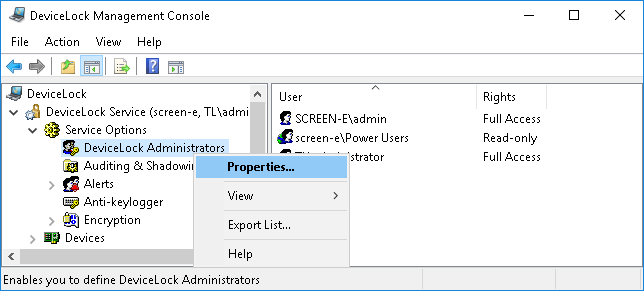 Click Properties on the shortcut menu of the DeviceLock Administrators item to open the configuration dialog box.