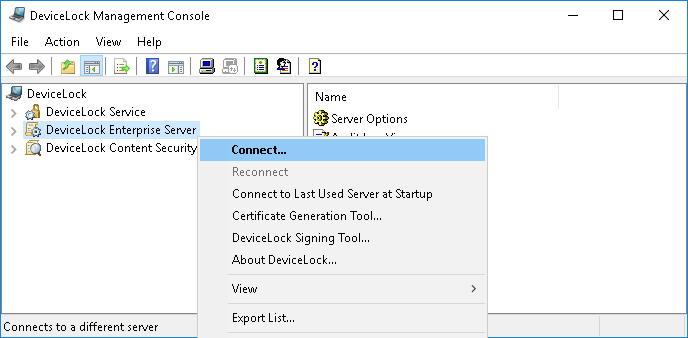 The following commands are provided on the shortcut menu available by right-clicking the DeviceLock Enterprise Server node: