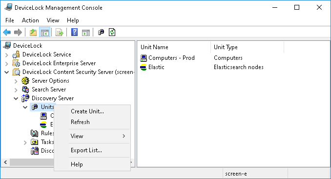 All units that currently exit on the server are listed in the console tree under DeviceLock Content Security Server > Discovery Server > Units.