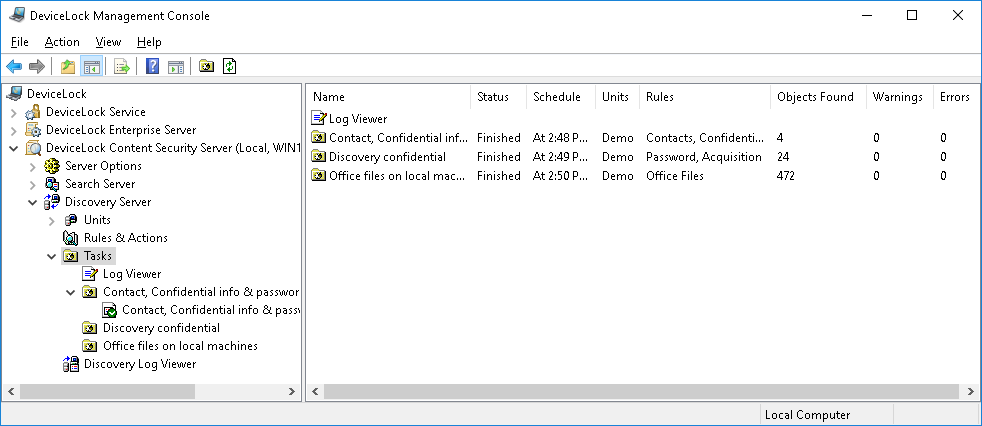 All discovery tasks along with their log and reports are available in the console tree under DeviceLock Content Security Server > Discovery Server > Tasks.