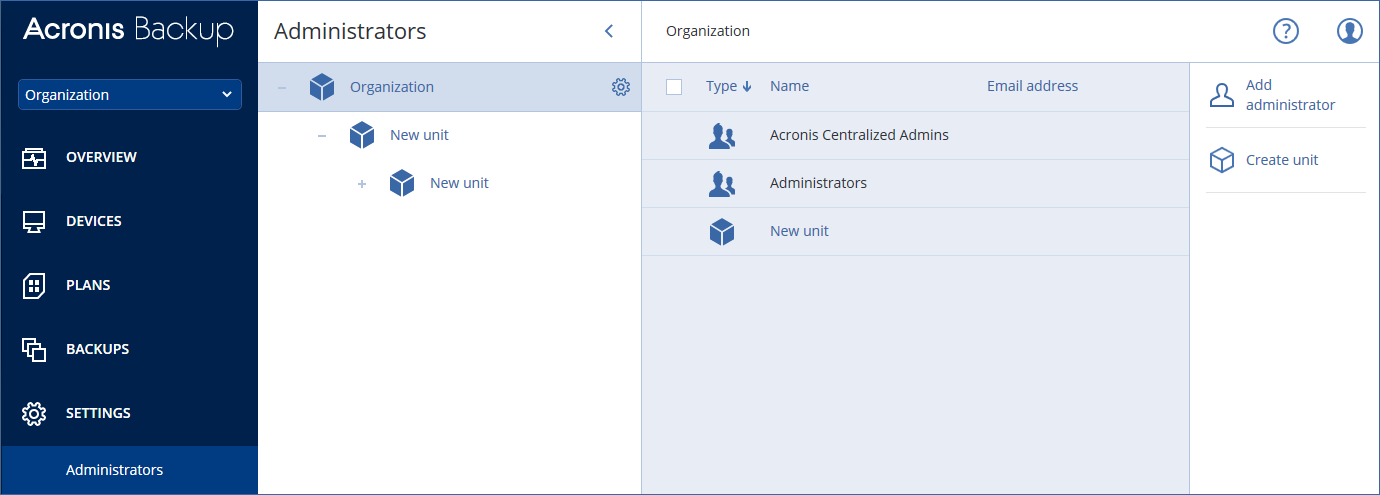 Группа Организация автоматически создается при установке сервера управления. При наличии лицензии Acronis Backup Advanced можно создать дочерние группы, называемые «отделами», которые, как правило, соответствуют отделам или подразделениям организации, и добавить в них администраторов.