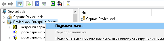 1. Подключите консоль к компьютеру, на котором работает DeviceLock Enterprise Server или DeviceLock Content Security Server. Используйте команду Подключиться из контекстного меню, доступного по нажатию правой кнопки мыши.