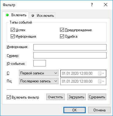 •Информация, Сервер, ID-события - Включение или исключение из списка событий, у которых в указанном поле данных встречается заданная строка. Например, для фильтрации событий по имени компьютера, на котором произошло событие, укажите строку фильтра в поле Сервер. Для фильтрации событий с определенными номерами, введите номера искомых событий в поле ID-события, используя точку с запятой в качестве разделителя.