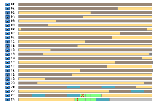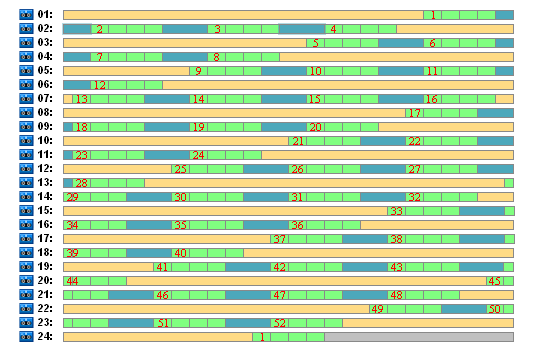 На следующем рисунке показано текущее использование лент со свободным пространством вместо удаленных резервных копий в первую пятницу следующего года. В это время дифференциальная резервная копия (синий прямоугольник) записывается на ленту 24.