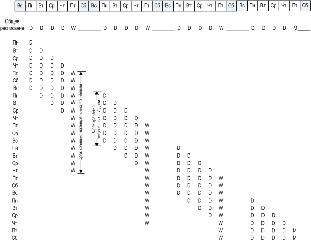 В левом столбце представлены дни недели. Для каждого дня недели показано содержимое архива после очередного резервного копирования и последующей очистки.