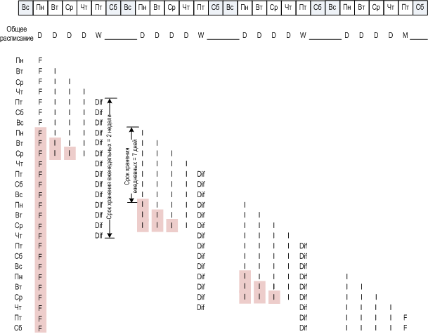 Ниже представлен первый месяц плана резервного копирования в реальной обстановке. «F» обозначает полную резервную копию. «Dif» — дифференциальная резервная копия. «I» — инкрементная.