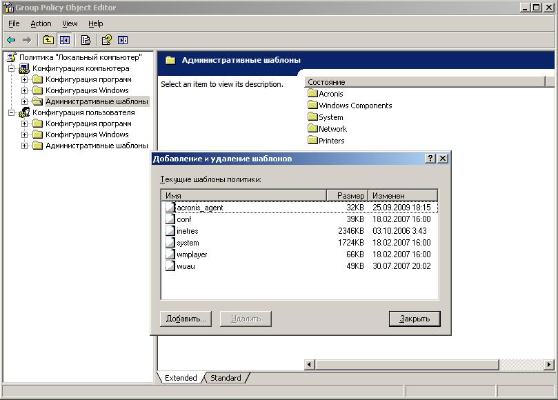 Административный шаблон, предоставляемый Acronis, позволяет выполнять тонкую настройку некоторых функций обеспечения безопасности, включая параметры зашифрованного обмена данными. Посредством механизма групповой политики Майкрософт можно применять параметры политики шаблонов к одному компьютеру или к домену.