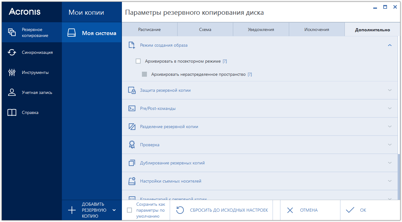 Чтобы вернуть все измененные параметры в исходные значения, заданные после установки продукта, нажмите кнопку Восстановить исходные настройки. Отметим, что это приведет к сбросу параметров только для текущего резервного копирования. Чтобы сбросить параметры для будущих операций резервного копирования, нажмите Восстановить исходные настройки, выберите флажок Сохранить параметры по умолчанию и нажмите ОК.