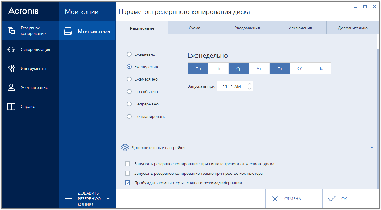 Не планировать — для текущей операции планировщик будет отключен. В этом случае резервное копирование или проверка будут запущены только при нажатии соответственно кнопки Архивировать или Проверить в главном окне.