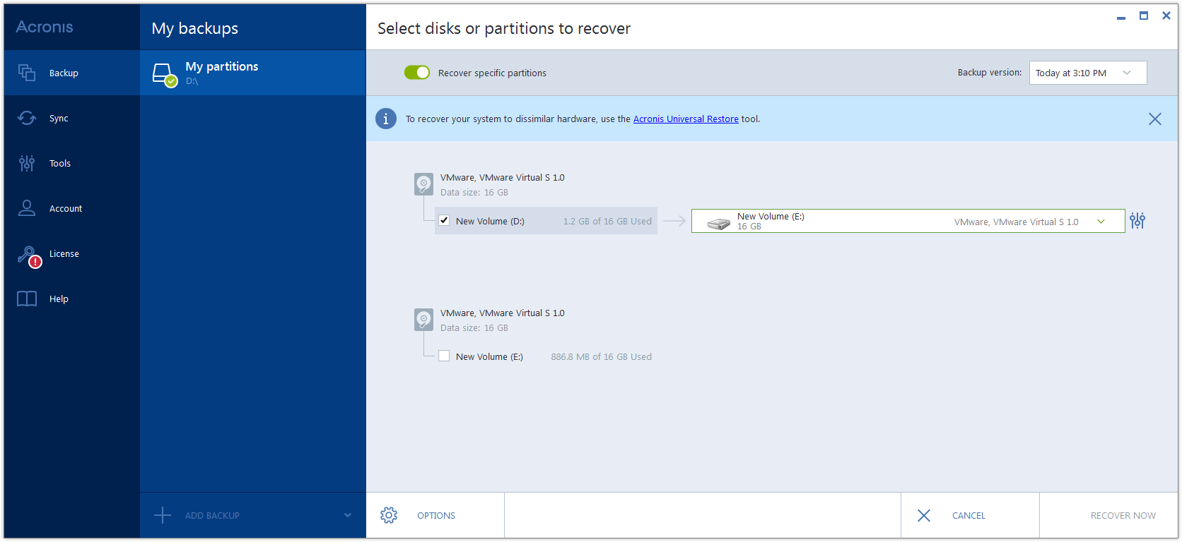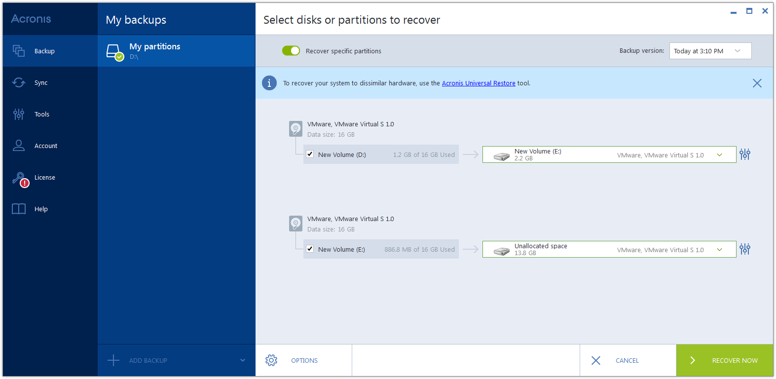Следующая процедура применима только для восстановления на базовый диск. Восстановление на динамический диск с изменением размеров разделов невозможно.