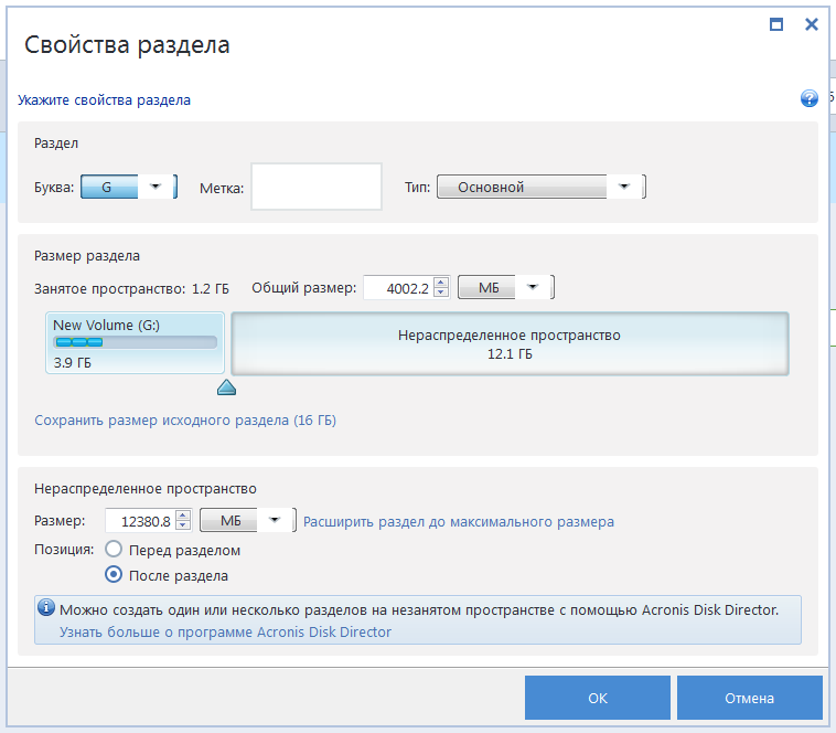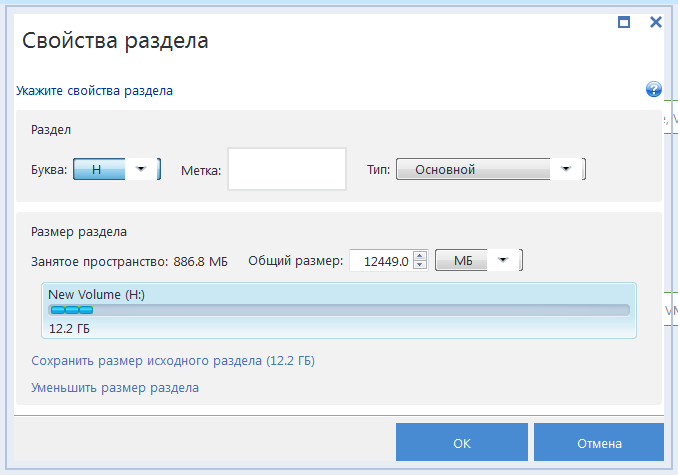 После изменения размера раздела необходимо оставить столько нераспределенного (свободного) пространства, сколько потребуется для оставшегося раздела. Выберите букву диска и тип раздела. Когда настройки будут заданы, нажмите кнопку ОК, чтобы подтвердить их и вернуться в главное окно «Восстановление диска».
