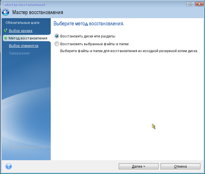 В шаге Метод восстановления выберите Восстановить диски или разделы.