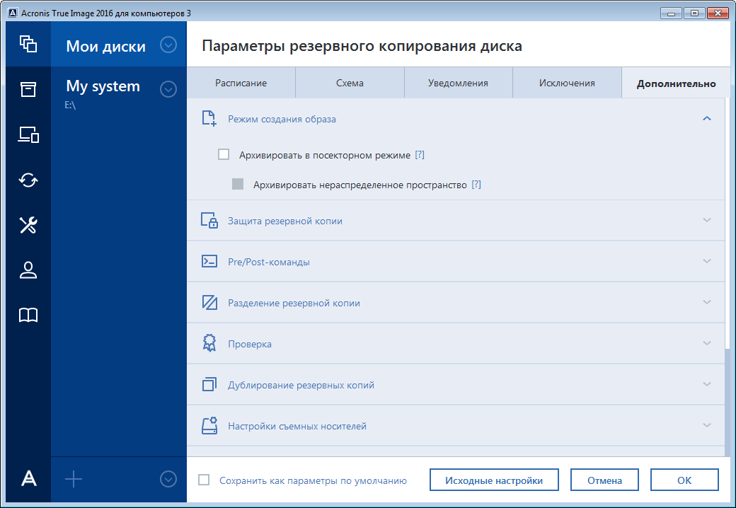 После установки приложения все параметры будут установлены в начальные значения. Параметры можно изменить только на время выполнения текущей операции резервного копирования или для всех последующих операций. Установите флажок Сохранить текущие настройки как настройки по умолчанию, чтобы применить по умолчанию измененные настройки ко всем последующим операциям резервного копирования.