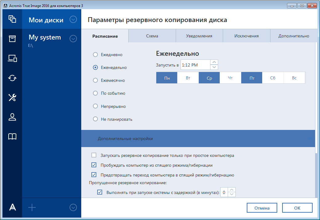Если в запланированное время компьютер будет отключен, операция не будет выполнена. Пропущенную операцию можно принудительно запустить при следующем запуске системы. Для этого установите флажок Выполнять при запуске системы.