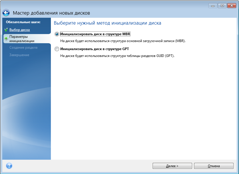 Если используется 32-разрядная версия Windows XP, метод инициализации GPT будет недоступен и шага Параметры инициализации не будет.