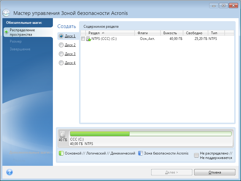Выберите жесткий диск, на котором будет создана Зона безопасности Acronis.