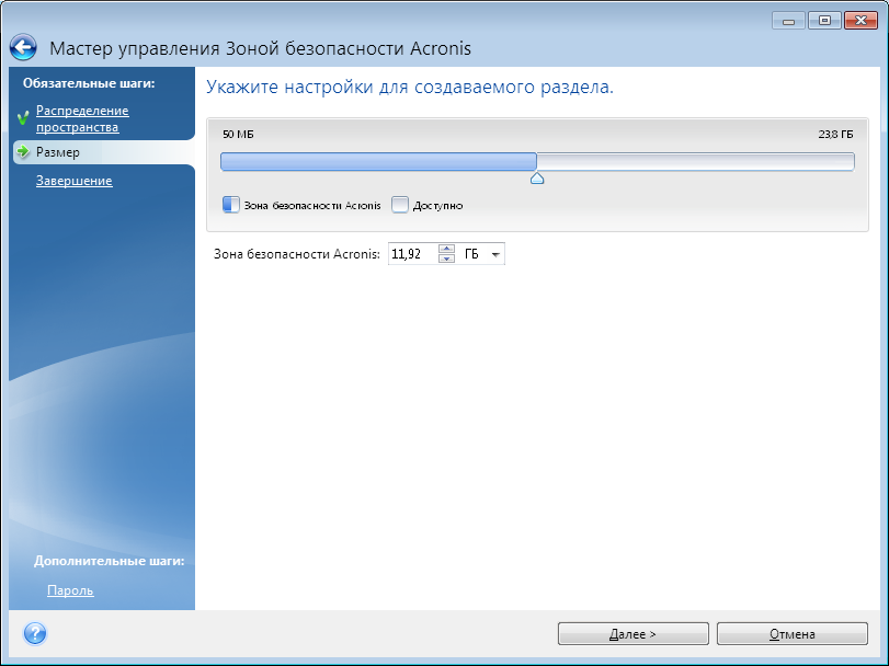При создании или расширении Зоны безопасности Acronis программа сначала использует незанятое пространство. Если нераспределенного пространства недостаточно для размещения зоны требуемого размера, размер выбранных разделов будет уменьшен. Изменение размера разделов может потребовать перезагрузки компьютера.